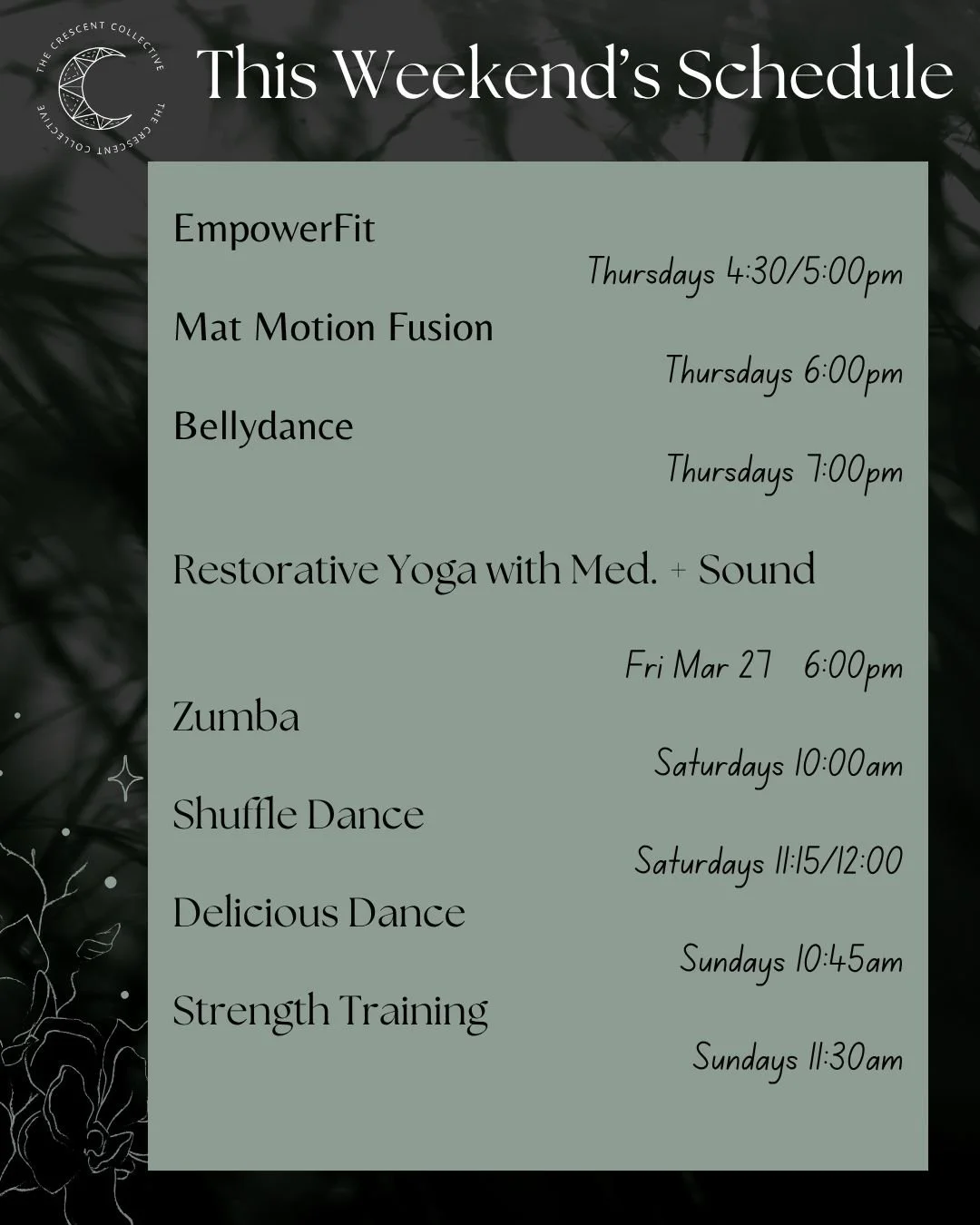 The Crescent Collective was born out of the marriage of their two business names, Bella Luna Bellydance and Blue Moon Growth Co., and opened its doors in February 2022. We’ve become home to so many providers, each maintaining their individual identities while sharing space and a goal: to hold space for our community to integrate body, mind, and spirit through combined holistic practices.
