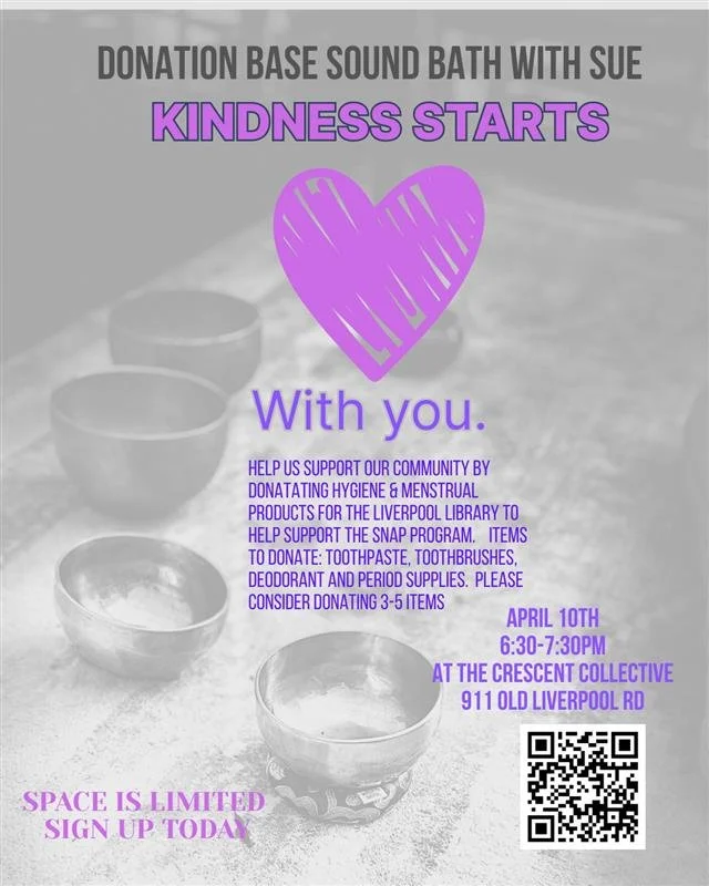 Sound Bath with Sue Friday, April 10, 2026 6:30 PM 7:30 PM The Crescent Collective 911 Old Liverpool Road Liverpool, NY, 13088 United States (map) Google Calendar ICS